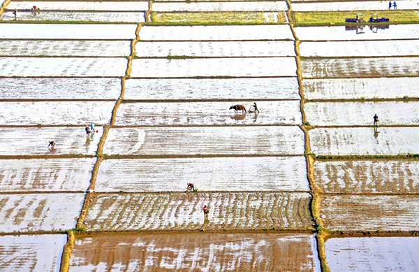 4月9日,江西省永丰县七都乡恩江灌区农民在水稻田中劳作。