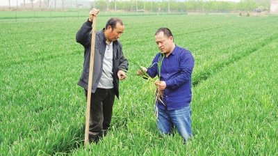 豫北小麦即将进入抽穗期,水肥科学运用成为小麦生长中后期管理的重要事项。 近日,河南省获嘉县农技推广中心高级农艺师王庆安(右一)对正在浇地的农户进行技术指导。