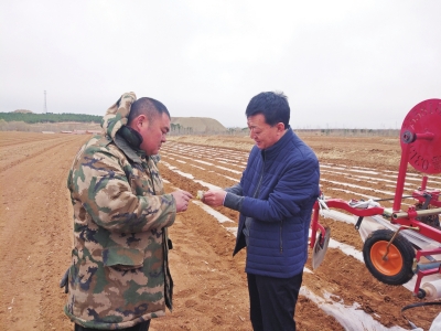 春耕时节,辽宁省建平县农业技术推广中心主任方子山(右一)指导农户机械播种马铃薯。