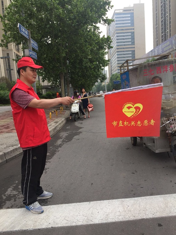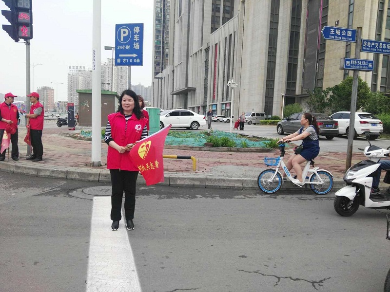 5月1日省级文明单位——洛阳市农业局志愿者来到西工区王城大道与唐宫东路路口,开展“礼让斑马线、我为你点赞”文明劝导活动,服务全市节日交通安全。 中午12时30分,志愿者与执勤交警对接后,经过执勤交警的简单岗前培训,交通志愿者们愉快地走上了劝导岗位。所有志愿者手持“市直机关志愿者”指引旗,头戴志愿者帽子,在东、西、南、北四个分岔口开展文明劝导体验活动。志愿人员动作规范,文明用语,对闯红灯、越线等待、跨越中间护栏等不文明行为及时劝导,提示车辆减速礼让行人,按道行驶;提示行人文明有序通行,不闯红灯。在志愿者认真、耐心劝导下,过往车辆能够主动减速,停车让行人先行,行人按规定行走。执勤交警对交通青年志愿者们的文明劝导活动同步进行了考核,并给予了充分肯定。