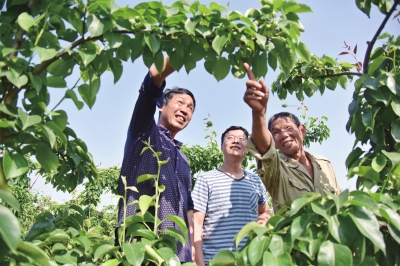 近日,在河南省社旗县朱集镇袁老庄村,相奎芦荟果蔬专业合作社发起人刘相奎(右一)正在指导社员为黄金梨疏果。成立于2010年12月的相奎芦荟果蔬专业合作社以服务种植芦荟、红参、黄金梨等为主,现已发展入社会员182户、286人,带动贫困户52户、187人发家致富。