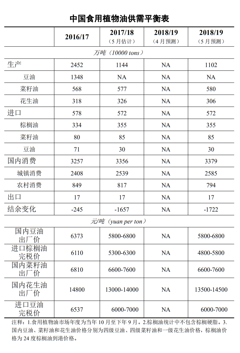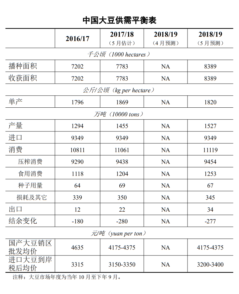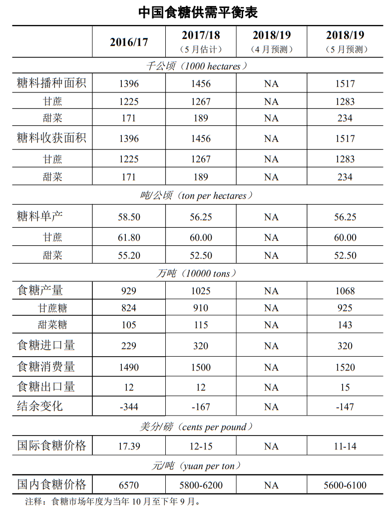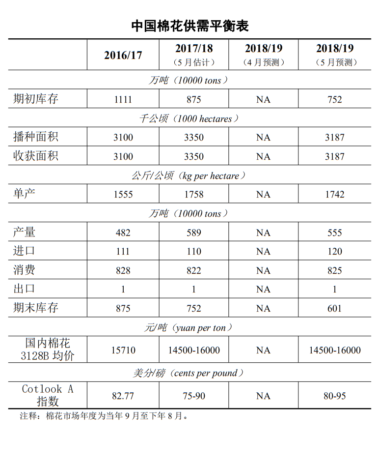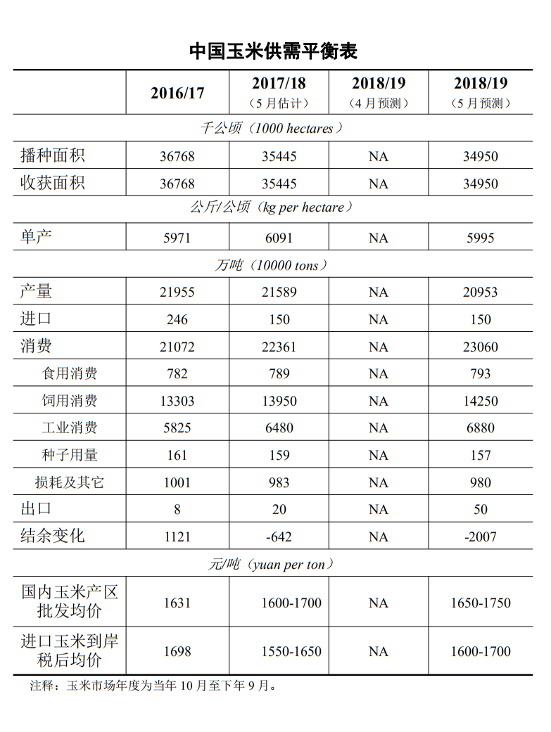玉米:本月估计,2017/18年度中国玉米出口量20万吨,比上月预测数调减30万吨。主要是国内玉米产不足需,出口低于预期。其他估计不变。 本月预测,2018/19年度,中国玉米播种面积将调减至34950千公顷,比上年度减少495千公顷。单产每公顷5995公斤,比上年度减1.6%。总产量2.10亿吨,比上年度减2.9%。产量减少的主要原因,一是东北地区大豆生产者补贴高于预期,非优势产区玉米种植面积继续减少;二是东北部分玉米主产区干旱较重,预计将拖累玉米单产。受原料成本下降、生猪养殖规模提升和玉米加工产能增加等多因素影响,玉米消费继续增加。其中,饲用消费1.43亿吨,比上年度增2.2%,保持刚性增长;工业消费6880万吨,比上年度增6.2%,维持较快增长。当年玉米产不足需,继续挖库弥补,预计期末结余变化量减少2007万吨,缺口比上年度扩大1365万吨。受全球玉米减产预期,预计2018/19年度中国进口玉米到岸税后均价每吨1600-1700元,中间值较上年度上调50元。 玉米首席分析师 大豆:本月估计,2017/18年度,中国大豆播种面积7783千公顷,比上年度增加8.1%;全国平均单产每公顷1869公斤,比上年度增加4.1%;大豆总产量1455万吨,比上年度增加12.4%。 本月预测,2018/19年度,在大豆主产区轮作休耕补贴政策和东北产区大豆生产者补贴政策推动下,中国大豆播种面积预计继续增加,达到8389千公顷,比上年度增加7.8%;目前东北地区大豆已开播,预计5月份内蒙古东部、东北地区大部降水量较常年偏少,全国平均单产将低于上年;大豆总产量1527万吨,比上年度增加4.9%;受国内大豆继续增产、大豆需求增速放缓等因素影响,预计大豆进口量9565万吨,比上年度减少0.3%;国内畜禽养殖业发展仍将拉动饲料原料消费量增加,但生猪养殖利润下滑将促使蛋白饲料添加比例回调,预计国内豆粕需求增速将放缓,大豆压榨消费量9454万吨,比上年度增加0.2%;大豆食用消费量1253万吨,比上年度增加4.1%。在全球大豆需求的拉动下,国际大豆价格仍将延续底部抬升态势,预计2018/19年度进口大豆到岸税后中间价区间为每吨3200-3400元,比上年度抬升50元;国产大豆销区批发均价区间为每吨4175-4375元。 大豆首席分析师 棉花:本月估计,2017/18年度中国棉花播种面积为3350千公顷,单产为每公顷1758公斤,总产量为589万吨,维持上月预测不变。纺织服装出口回暖,纺织企业订单充足,棉花需求平稳,棉花消费量维持822万吨不变。 本月预测,2018/19年度,中国棉花播种面积为3187千公顷,较上年度减少4.9%。尽管近三年新疆棉花补贴政策稳定,但受植棉比较收益低和劳动力短缺影响,新疆棉农植棉积极性有所下降;内地棉区受植棉收益较低、劳动力机会成本高以及棉花卖难等因素影响,植棉面积继续萎缩。棉花单产为每公顷1742公斤,较上年度下降0.9%。棉花产量为555万吨,较上年度减少5.8%。棉花进口量为120万吨,较上年度增加10万吨。新年度仍处于棉花去库存阶段,但国内高品质皮棉供给不足,预计棉花进口量增加。棉花消费量为825万吨,与上年度持平略增。新年度国内库存仍然宽裕,预测2018/19年度国内3128B级棉花均价在每吨14500-16000元区间。国际棉花供需格局收紧,预测2018/19年度Cotlook A指数均价在每磅80-95美分区间运行。 棉花首席分析师 食用植物油:本月估计,2017/18年度,中国食用植物油产量2793万吨,比上月估计数调增6万吨,主要是因为油菜籽单产调增带动菜籽油产量调增。冬油菜播种以来,产区大部光热适宜、墒情良好,干旱、低温冻害和病虫害发生范围小、影响偏轻,气象条件总体利于油菜生长发育和产量形成,但仍需密切关注收获前可能出现的长期阴雨天气。食用植物油进口量572万吨,较上月调减1万吨,主要是因为花生产量较上年度明显增加,花生油进口需求进一步回落。 本月预测,2018/19年度,中国食用植物油产量2779万吨,较上年度减少14万吨。其中,因大豆压榨量较上年度增加,豆油产量较上年度增加2万吨,达1652万吨;菜籽油产量589万吨,较上年度增加12万吨,主要是因为油菜种植效益恢复,意向播种面积增加,同时中加贸易关系相对稳定,有利于油菜籽进口增加。花生油产量306万吨,较上年度减少20万吨,主要是因为花生种植比较效益下滑,意向播种面积较上年度明显减少;棉籽油等其他植物油较上年度减少8万吨。食用植物油进口量572万吨,与上年度持平。国内消费量3379万吨,较上年度增加23万吨,主要因为全国人口总量和城镇化水平均预期进一步提升。 食用植物油首席分析师 食糖:本月估计,2017/18年度国际食糖价格每磅12-15美分,上、下限均比上月估计调低1美分,主要是由于印度、泰国等世界食糖主产国大幅增产,导致国际食糖市场供给过剩。受此影响,国内食糖价格每吨5800-6200元,上、下限均比上月估计调低300元。 本月预测,2018/19年度中国糖料播种面积1517千公顷,较2017/18年度增加61千公顷,增幅4.2%。糖料播种面积增加的主要原因是主产区糖料收购价格较高,糖农种植积极性提升。糖料入榨量和食糖产量预期增加,2018/19年度中国食糖产量1068万吨,较2017/18年度增加43万吨,增幅4.2%。2018/19年度中国食糖进口量320万吨,与2017/18年度持平;食糖出口量15万吨,较2017/18年度增加3万吨,主要是由于转口贸易增加。2018/19年度中国食糖消费量1520万吨,较2017/18年度增加20万吨,原因在于预期食糖价格下行,有助于提振食糖消费。2018/19年度国际食糖均价每磅11-14美分,均值较2017/18年度降低1美分,